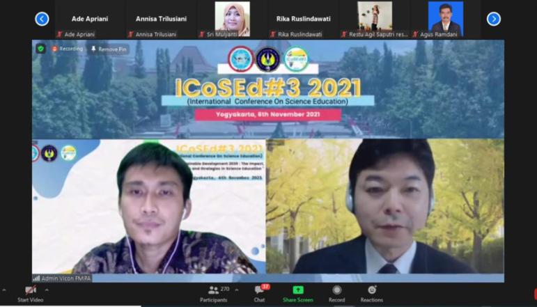 Hal tersebut disampaikan oleh Prof. Hiroki Fujii, Ph.D., dari Okayama University, Jepang, pada acara International Conference on Science Education#3 (ICoSEd#3) 2021 yang diselenggarakan oleh Jurusan Pendidikan IPA FMIPA UNY bekerjasama dengan Perkumpulan Pendidik IPA Indonesia (PPII). Seminar dengan tema Educational Sustainable Development 2030: The Impacts, Challenges, and Strategies in Science Education diselenggarakan secara daring pada Sabtu (6/11/21). Pembicara lain pada seminar tersebut yaitu Prof. Alipasa Ayas, Ph.D., dari Bilkent University Turkey, Assoc Prof. Gilian Kidman dari Monas University Australia, serta Prof. Dr. Phil. Ari Widodo dari UPI Bandung.