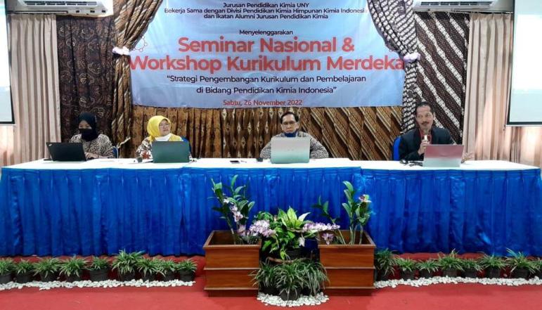 Jurusan Pendidikan Kimia FMIPA UNY bekerjasama dengan Divisi Pendidikan Kimia Himpunan Kimia Indonesia (HKI) dan Ikatan AlumniJurusan Pendidikan Kimia menyelenggarakan Seminar Nasional dan Workshop Kurikulum Merdeka. Seminar dengan tema Strategi Pengembangan Kurikulum dan Pembelajaran di Bidang Pendidikan Kimia Indonesia ini diselenggarakan pada Sabtu, 26/11/22 di Ruang Seminar FMIPA UNY. Hadir sebagai pembicara adalah Prof. Dr. KH Sugiyarto dari UNY, Prof. Sulistyo Saputro, M.Si., Ph.D., dari Universitas Sebelas Maret Surakarta, dan Prof. Dr. Edy Cahyono, M.Si., dari Universitas Negeri Semarang.
