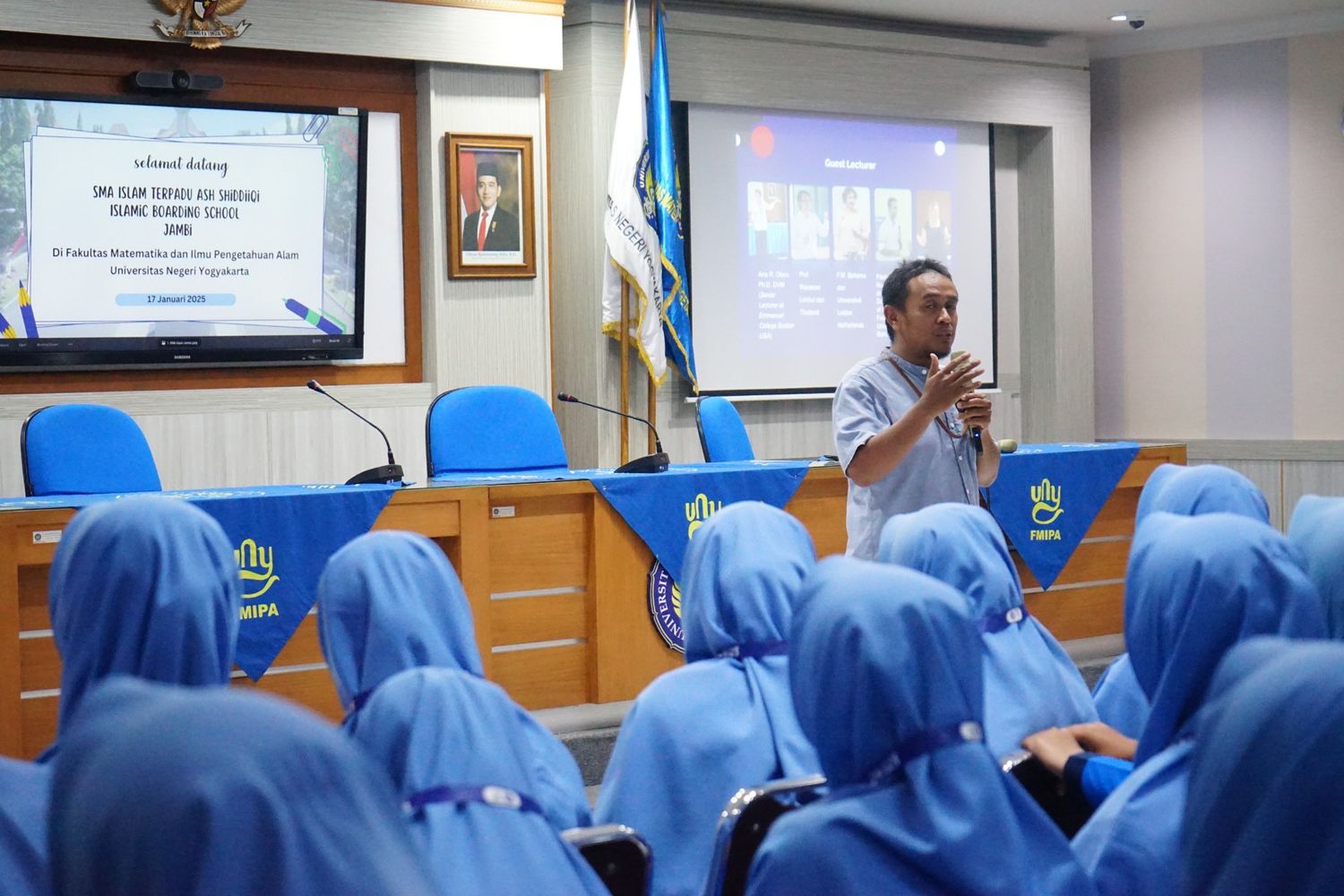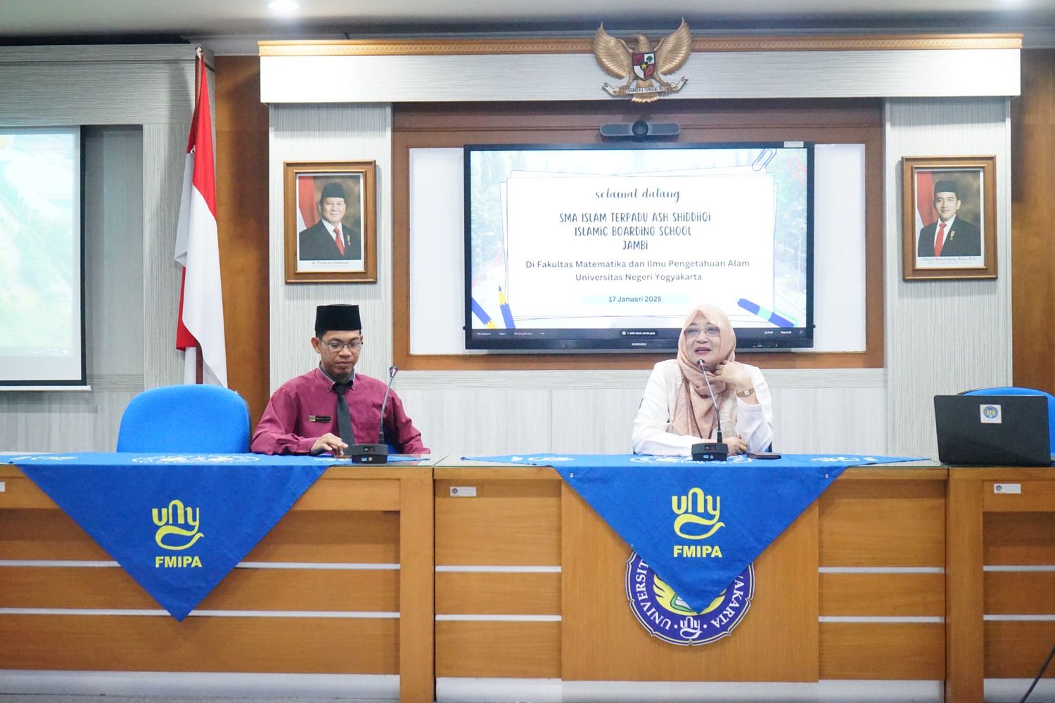 Fakultas Matematika dan Ilmu Pengetahuan Alam Universitas Negeri Yogyakarta menerima kunjungan dari Para siswa kelas 11 SMA Islam Terpadu Ash Shiddiqi Islamic Boarding School Jambi dalam rangka studi kampus. Kegiatan ini dilaksanakan pada hari Jumat (17/01/2025) di Ruang Sidang 2 FMIPA UNY.
