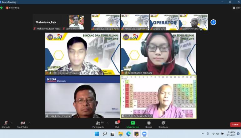 Acara talkshow inspiratif bersama alumni yang diselenggarakan sebagai salah satu rangkaian kegiatan Dies Natalis ke-57 Fakultas Matematika dan Ilmu Pengetahuan Alam (FMIPA) Universitas Negeri Yogyakarta (UNY) telah sukses dilaksanakan oleh Kelurga Magister dan Doktor (KMMD) UNY pada Sabtu, 11/9/21 secara daring . Talkshow mengusung tema "Sharing Experience: Be Successful Along with FMIPA Alumni” dengan narasumber Achmad Khambali, S.Pd., M.M. (alumni pendidikan kimia tahun 1999) dan Januar Widakdo, S.Si., M.Sc., Ph.D. (alumni pendidikan fisika tahun 2011) dengan moderator Febriani, S.Pd., mahasiswa magister fisika 2021.