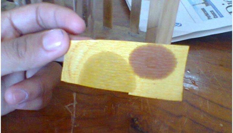 Na’in menjelaskan pembuatan paper test kit ini, yaitu kunyit ditumbuk halus dengan menggunakan mortar, ditambah sedikit air, dan disaring didalam beaker glass. Air kunyit didalam beaker glass sebagian dituangkan pada petridish. Kertas whatman dicelupkan kedalam petridis dan dibolak balik hingga semua permukaannya rata dengan air kunyit, kemudian kertas whattman ditata diatas papan dan dikeringkan dibawah terik sinar matahari. Selanjutnya melakukan langkah diatas pada larutan kunyit dengan perbandingan 5 ml kunyit dan 1 ml air. Selanjutnya melakukan uji daya kesensitivan paper test kit.