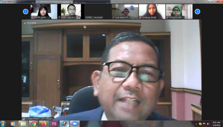 Fakultas Matematika dan Ilmu Pengetahuan Alam Universitas Negeri Yogyakarta (FMIPA UNY) menyelenggarakan acara Penyambutan Mahasiswa Program Magister FMIPA UNY secara virtual pada Selasa, 9/2/21. Acara diikuti oleh jajaran pimpinan, para ketua jurusan, para koorprodi program magister, para mahasiswa program magister, koordinator tata usaha, dan para sub koordinator.
