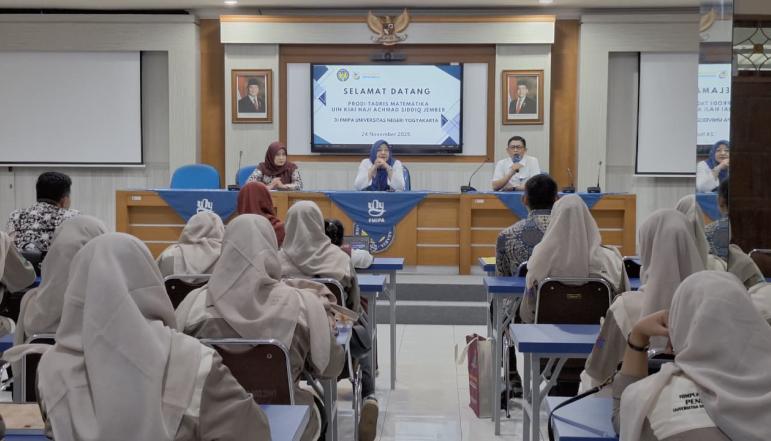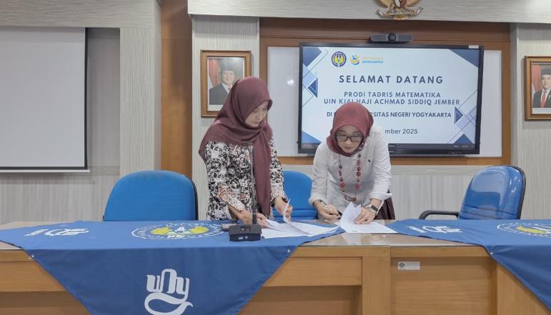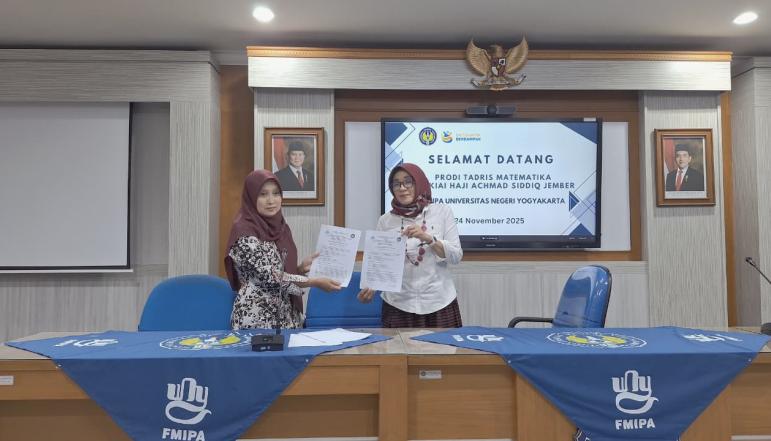 Program Studi Pendidikan Matematika Fakultas Matematika dan Ilmu Pengetahuan Alam (FMIPA) Universitas Negeri Yogyakarta resmi menjalin kerjasama strategis dengan Fakultas Tarbiyah dan Ilmu Pendidikan (FTIK) UIN Kiai Haji Achmad Siddiq (KHAS) Jember melalui kegiatan benchmarking dan penandatanganan nota kesepahaman, Senin (24/11/2025). Langkah ini menjadi upaya konkret kedua institusi dalam memperkuat mutu pendidikan matematika serta meningkatkan kualitas lulusan yang kompetitif dan berdaya saing.
