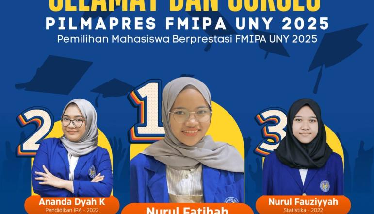 Fakultas Matematika dan Ilmu Pengetahuan Alam (FMIPA) Universitas Negeri Yogyakarta (UNY) resmi mengumumkan tiga mahasiswa terbaik yang terpilih sebagai Mahasiswa Berprestasi (Mawapres) dalam ajang Pemilihan Mahasiswa Berprestasi (Pilmapres) FMIPA UNY tahun 2025. Pengumuman tersebut disampaikan secara online pada (20/04/2025) via Instagram.