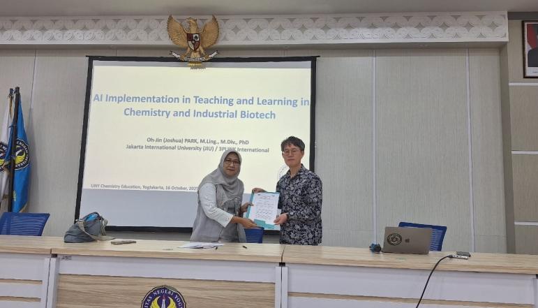 Fakultas Matematika dan Ilmu Pengetahuan Alam (FMIPA) Universitas Negeri Yogyakarta menyelenggarakan kegiatan Visiting Professor bersama Prof. Oh Jin Park, Ph.D. dari Jakarta International University (JIU), yang diikuti oleh mahasiswa S1, S2, dan S3 Pendidikan Kimia. Kegiatan ini mengangkat topik menarik bertajuk “An Implementation in Teaching and Learning in Chemistry and Industrial Biotech”, dengan fokus pembahasan pada pemanfaatan Artificial Intelligence (AI) dalam dunia pendidikan dan industri kimia. Kegiatan ini dilaksanakan hari Kamis (16/10/2025) di Ballroom Gedung Magister dan Doktoral FMIPA UNY.